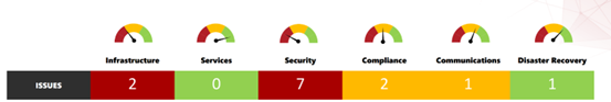 Next up? It’s time to pinpoint the gaps and risks you need to address for each service area. We recommend starting with a RAG (Red, Amber, Green) status for each area, as shown below, highlighting the number of issues against each. This helps you quickly flag which areas are urgent, which need attention soon, and which are in good shape.