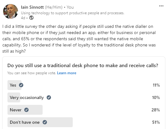 So, when I ran a survey on LinkedIn last week it was no surprising to see 78% of respondents never used a desktop phone, with over 50% of the total responders not even having one, but is that significant and if so, why?